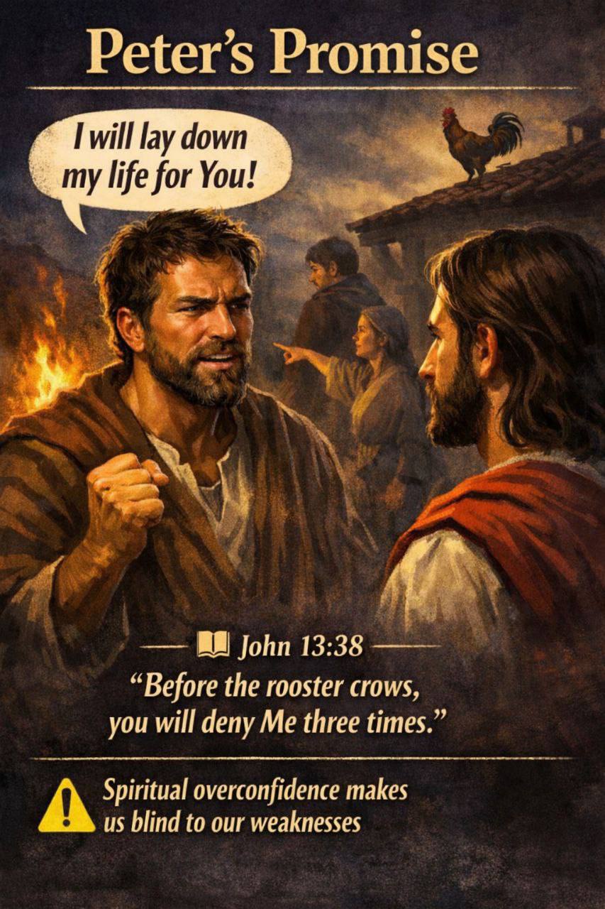 Peter’s words sound noble: “I will lay down my life for You.” He sincerely loves Jesus and wants to show his loyalty. But hidden in these words is a problem — an overestimation of his own spiritual strength. Peter believes his devotion is strong enough to withstand any test. Jesus immediately shows that Peter’s evaluation of himself is not accurate.