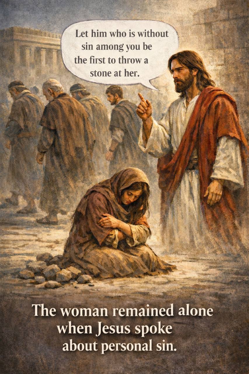 But she stayed. She remained before Jesus — without excuses, without defense, without masks. And she became the only person in the entire scene to hear words of forgiveness: “Neither do I condemn you.”