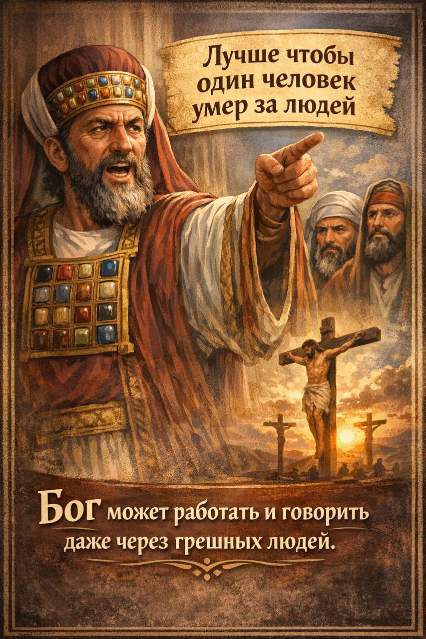 ✝️ Каиафа не собирался говорить об искуплении. Он хотел логически оправдать убийство. Но Бог вложил в его уста истину, выходящую далеко за пределы его намерений: Иисус действительно должен был умереть — искупительной смертью за людей.