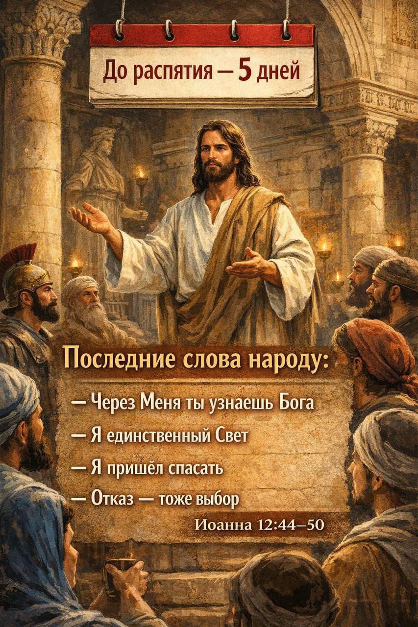 В день, когда народ готов был прославлять Его как Царя, Иисус говорит не о славе, а о спасении. Он использует последнюю возможность обратиться к людям: раскрывает, Кто Он, предупреждает о последствиях и предлагает жизнь. Через пять дней будет крест, но пока звучит голос — последний призыв света перед наступлением тьмы.