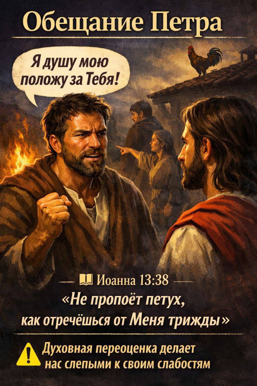 Слова Петра звучат благородно: «Я душу мою положу за Тебя». Он искренне любит Иисуса и хочет проявить верность. Но в этих словах скрывается проблема — переоценка собственной духовной силы. Пётр уверен, что его преданность достаточно сильна, чтобы выдержать любые испытания. Иисус сразу показывает, что Пётр ошибается в оценке самого себя.