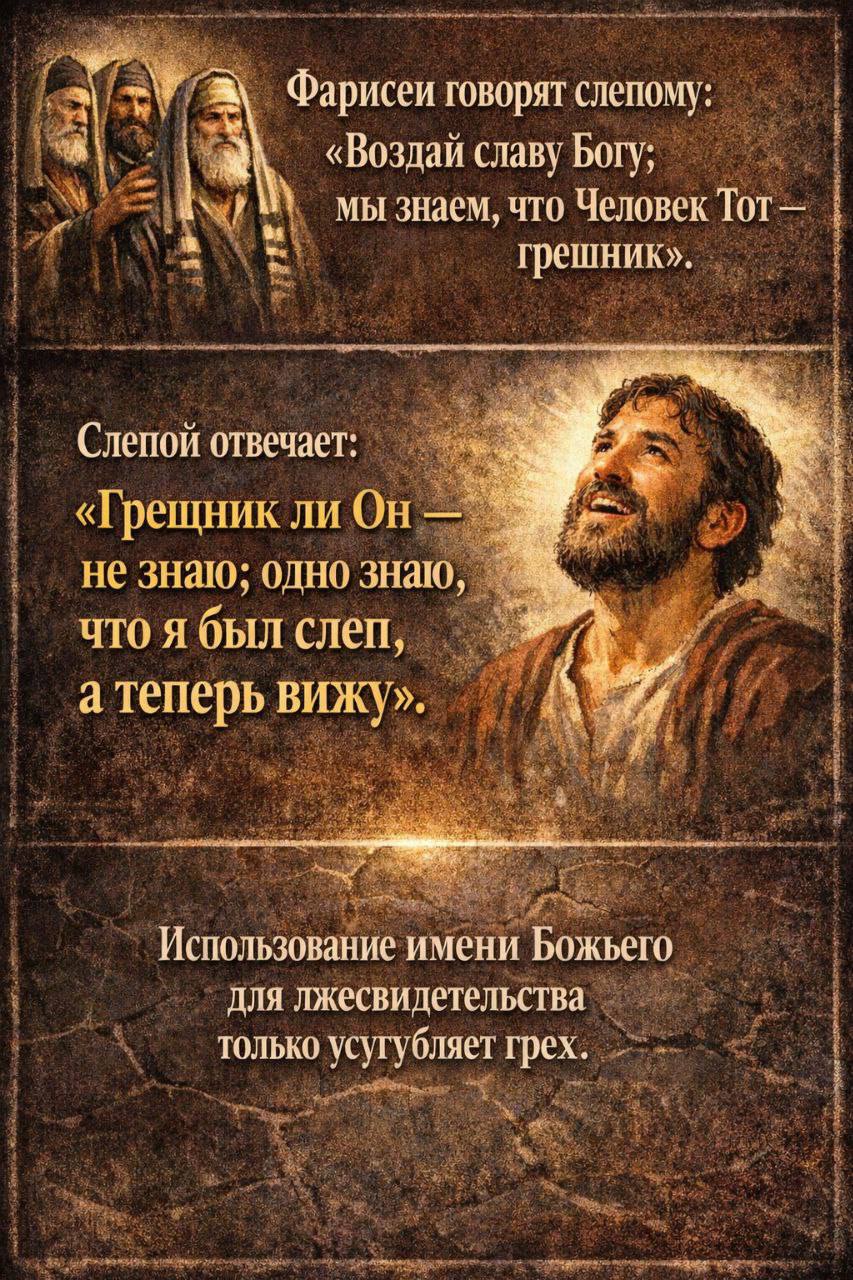 Фарисеи призывают Бога как высший авторитет, заявляют заранее готовый вывод — «мы знаем, что Он грешник», — и требуют, чтобы слепой подтвердил это утверждение. Фактически они говорят не «скажи правду», а: «подтверди нашу версию, сославшись на Бога».