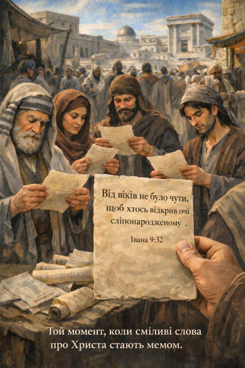 Вони не згадують перетворення води на вино й не перелічують інші чудеса. У центрі обговорення — саме прозріння сліпонародженого. Його фраза розійшлася містом, стала коротким і впізнаваним аргументом — тим, що сьогодні ми назвали б мемом.
