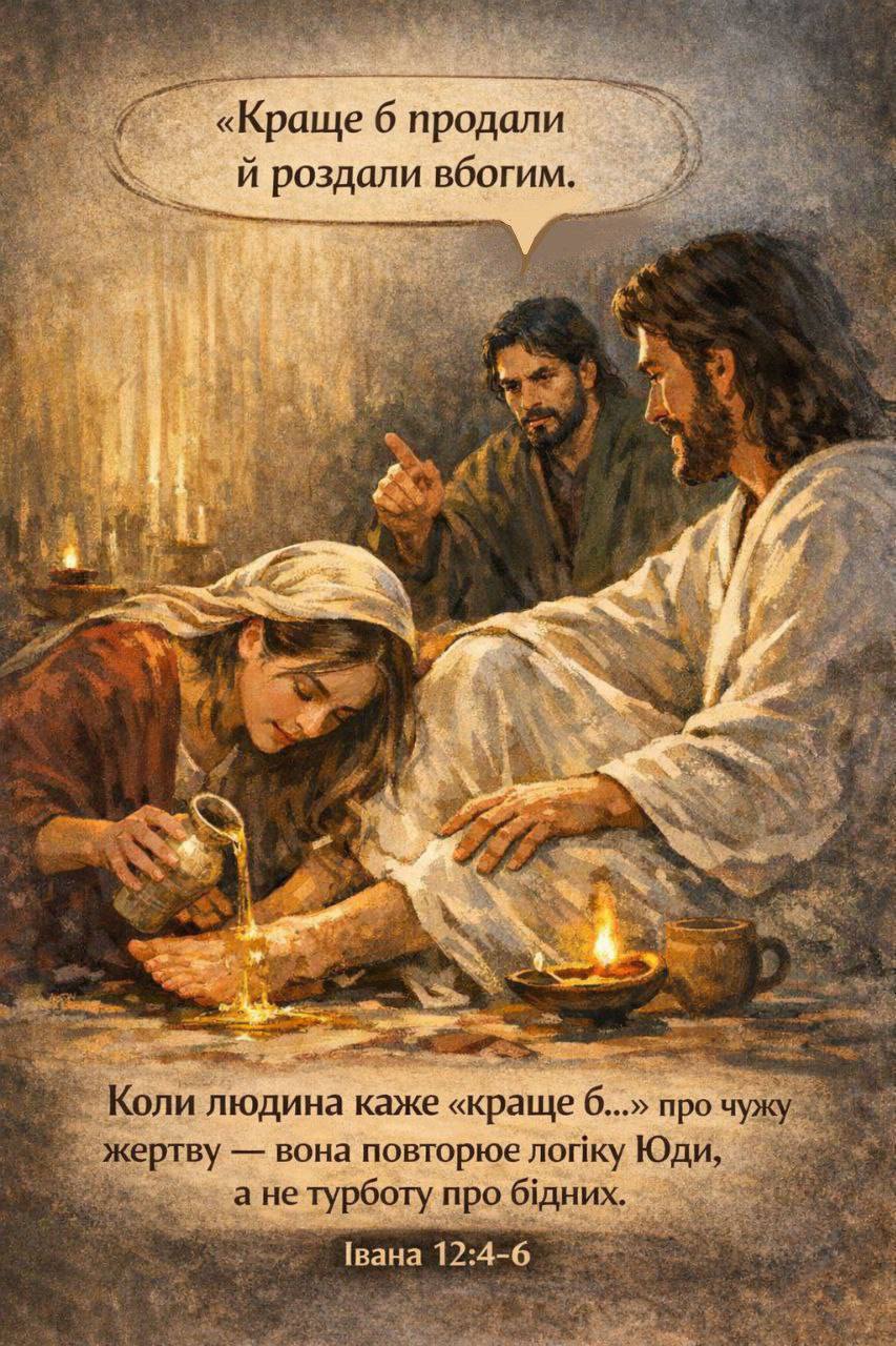 Не засуджувати інших людей за те, куди вони жертвують свої гроші. Не кожне «краще було б…» — це турбота. Іноді це логіка Юди. Бог дивиться не на перерозподіл, а на серце.