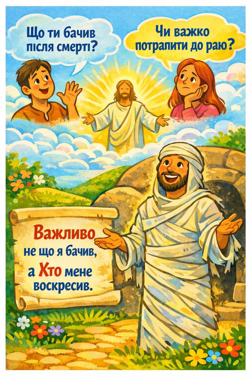 Ми не дізнаємося: що Лазар бачив, кого зустрів, чи відчував світло, чи переживав суд. Ми дізнаємося тільки одне — Ісус воскресив його.