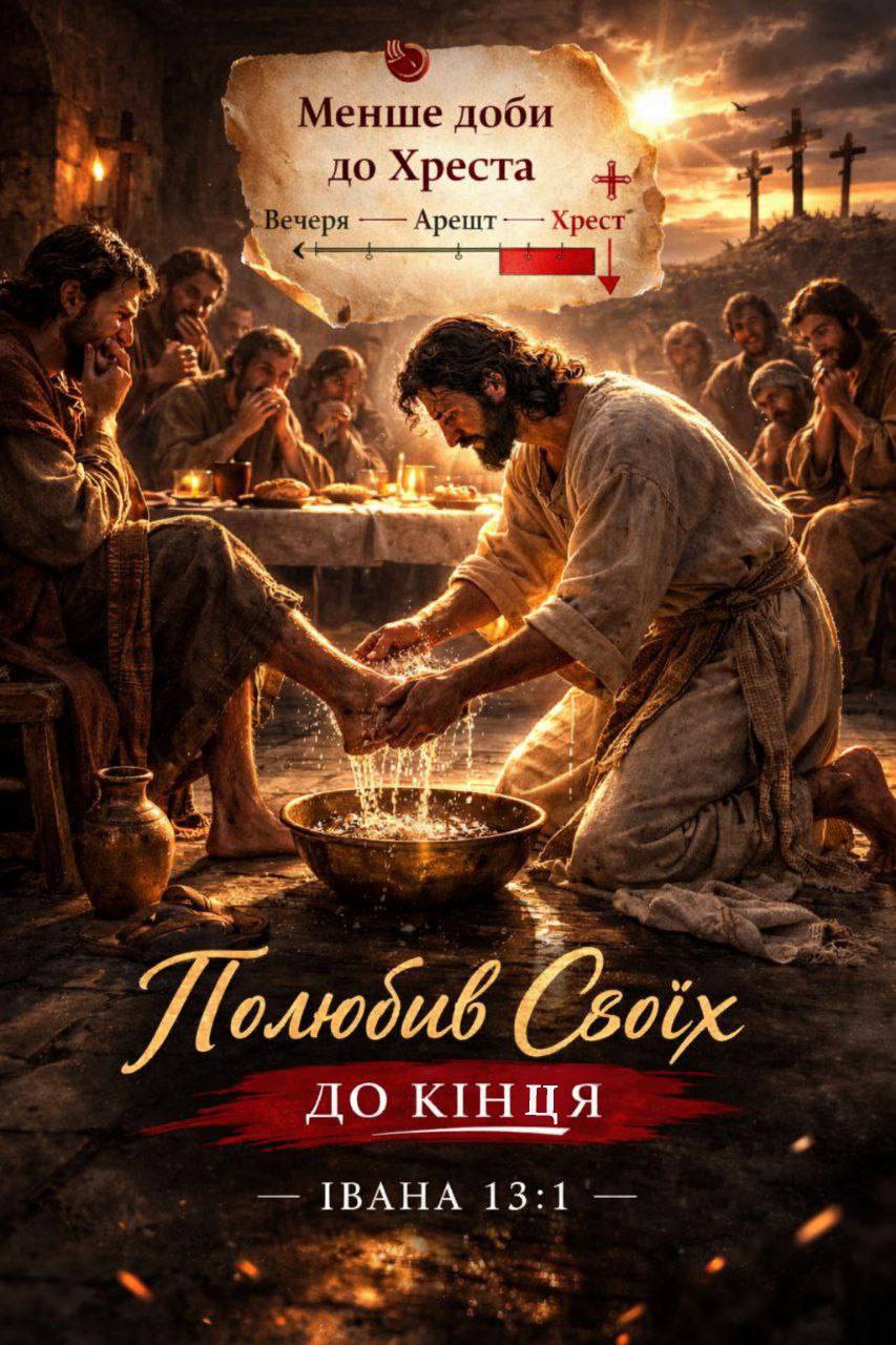 Як би ви прожили свій останній день життя? Напевно, сказали б важливі слова близьким, підбили підсумки, думали б про себе, про біль і прощання. Але останній день Ісуса проходить інакше. Він знає, що за кілька годин Його чекає хрест — і присвячує цей час не Собі. Він присвячує його учням. Не шукає підтримки, не просить утіхи, не захищається. Він стає слугою і починає мити їм ноги.