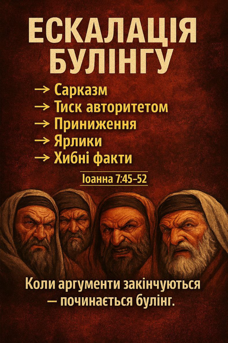 Булінг рідко починається з відкритої агресії. Найчастіше він розвивається поступово: з насмішки, тиску, приниження — і лише потім переходить до впевненої брехні. Саме таку ескалацію ми бачимо в розмові фарисеїв із храмовими служителями та Никодимом в Івана 7:45–52.