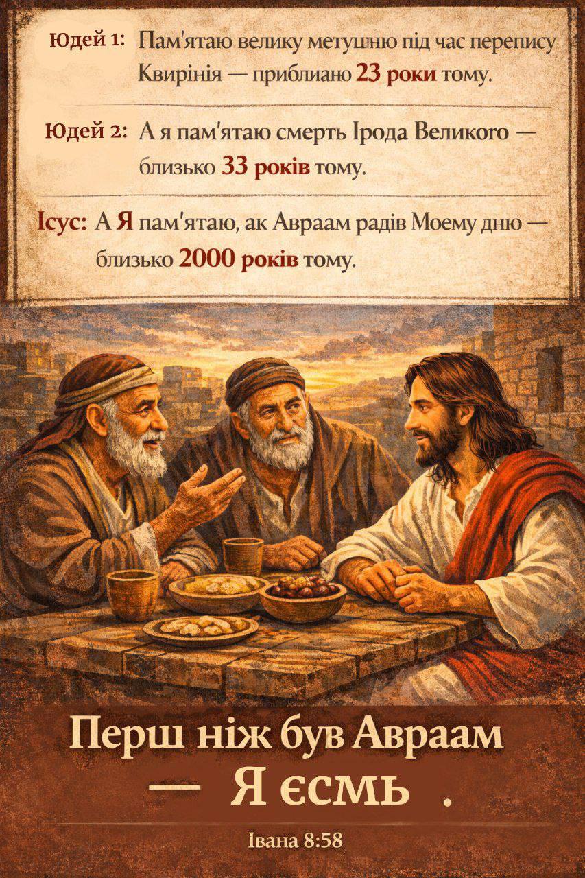 Але Ісус ламає саму логіку такого порівняння. Він не каже, що був старший за Авраама. Він говорить, що Його існування не починається в часі. Його буття — до історії, до втілення, до самого Авраама.