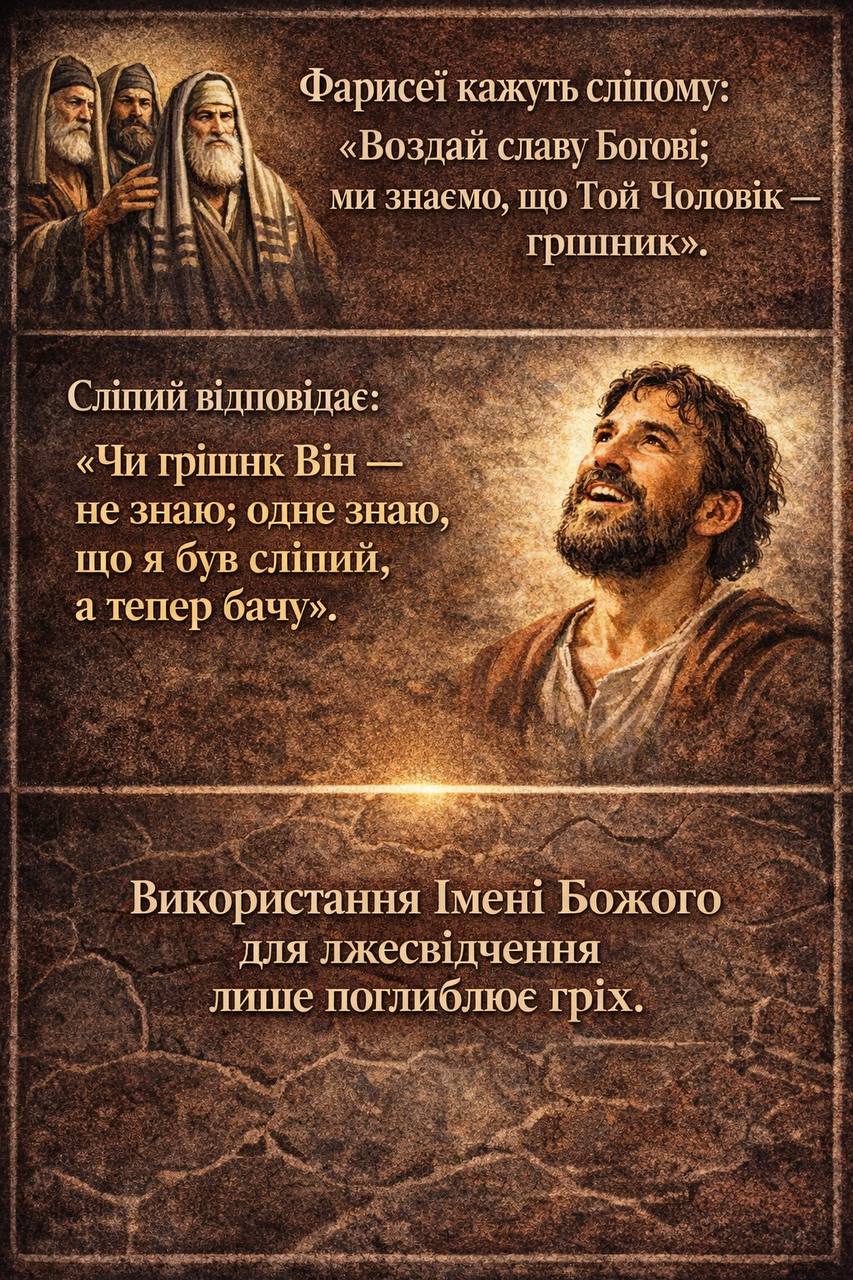 Фарисеї закликають Бога як найвищий авторитет, заявляють заздалегідь готовий висновок — «ми знаємо, що Він грішник», — і вимагають, щоб сліпий це підтвердив. Фактично вони кажуть не «скажи правду», а: «підтвердь нашу версію, посилаючись на Бога».
